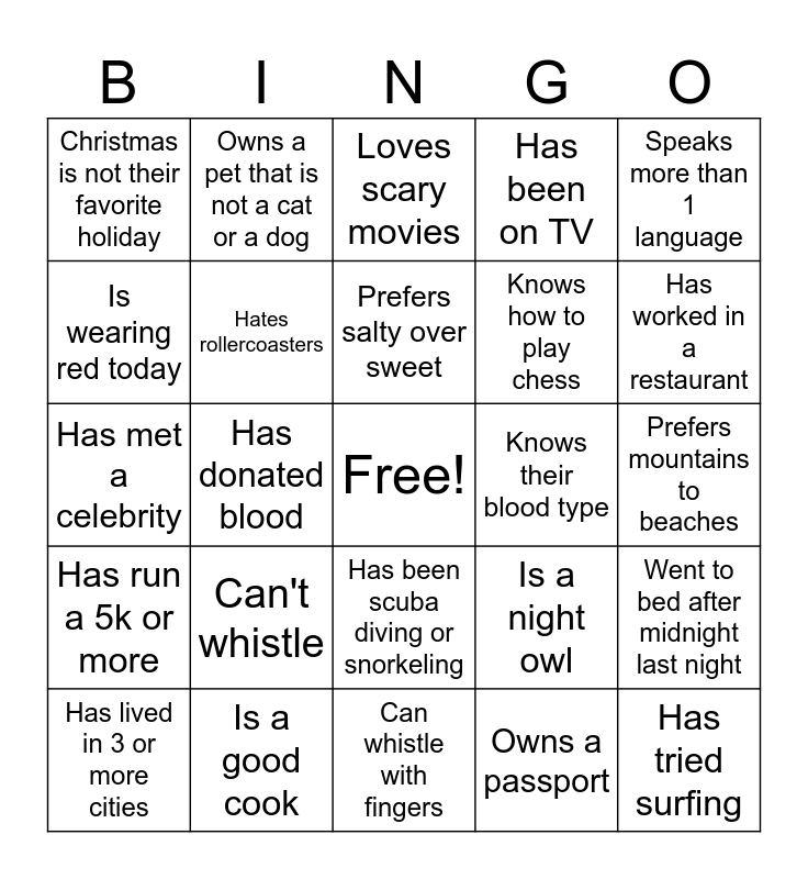 This bingo card has a free space and 30 words: Is a good cook, Knows a magic trick, Has donated blood, Is afraid of heights, Christmas is not their favorite holiday, Loves scary movies, Hates rollercoasters, Has been scuba diving or snorkeling, Knows their blood type, Can whistle with fingers, Prefers mountains to beaches, Has tried surfing, Owns a passport, Is the oldest sibling, Has worked in a restaurant, Loves karaoke, Is a night owl, Has run a 5k or more, Can't whistle, Speaks more than 1 language, Has met a celebrity, Is left handed, Owns a pet that is not a cat or a dog, Knows how to play chess, Is wearing red today, Has been on TV, Went to bed after midnight last night, Has lived in 3 or more cities, Prefers salty over sweet and Can play a musical instrument.