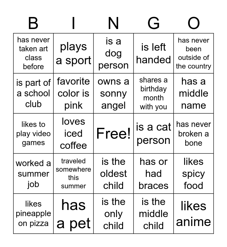 This bingo card has a free space and 24 words: traveled somewhere this summer, has a pet, owns a sonny angel, likes pineapple on pizza, has never been outside of the country, has never taken art class before, is part of a school club, plays a sport, is a cat person, is the oldest child, shares a birthday month with you, likes to play video games, has or had braces, likes spicy food, favorite color is pink, is the middle child, has never broken a bone, is a dog person, has a middle name, loves iced coffee, likes anime, worked a summer job, is left handed and is the only child.