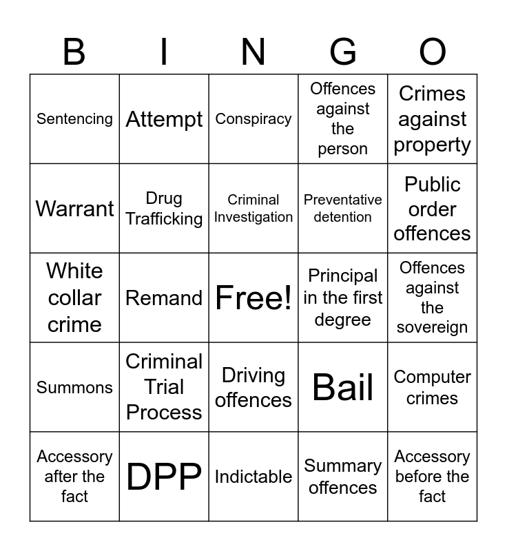 This bingo card has a free space and 24 words: Criminal Trial Process, DPP, Criminal Investigation, Accessory after the fact, Crimes against property, Sentencing, Warrant, Attempt, Principal in the first degree, Driving offences, Preventative detention, White collar crime, Bail, Computer crimes, Drug Trafficking, Summary offences, Offences against the sovereign, Conspiracy, Public order offences, Remand, Accessory before the fact, Summons, Offences against the person and Indictable.
