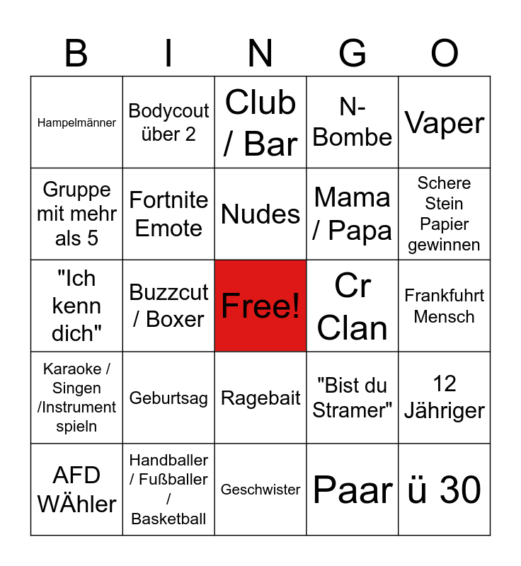 This bingo card has a free space and 24 words: AFD WÄhler, Geburtsag, Nudes, Paar, Vaper, Hampelmänner, Bodycout über 2, Club / Bar, Cr Clan, Frankfuhrt Mensch, "Ich kenn dich", Fortnite Emote, "Bist du Stramer", 12 Jähriger, Gruppe mit mehr als 5, Handballer / Fußballer / Basketball, Geschwister, N-Bombe, Schere Stein Papier gewinnen, Karaoke / Singen /Instrument spieln, Buzzcut / Boxer, Ragebait, Mama / Papa and ü 30.