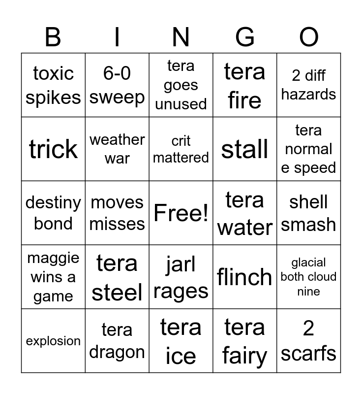 This bingo card has a free space and 24 words: tera steel, tera dragon, crit mattered, explosion, 2 diff hazards, toxic spikes, trick, 6-0 sweep, tera water, jarl rages, stall, destiny bond, flinch, glacial both cloud nine, weather war, tera fairy, shell smash, tera goes unused, tera normal e speed, moves misses, 2 scarfs, maggie wins a game, tera fire and tera ice.