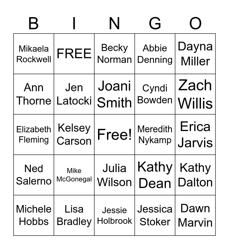 This bingo card has a free space and 35 words: Lindsay Johns, Annie Tiihonen, Drew Vansickle, Jen Latocki, Julia Wilson, Abbie Denning, Ann Thorne, Kaitlyn Brzezinski, Joani Smith, Carrie Duvall, Elizabeth Fleming, Dayna Miller, Pat Marvin, Kim Leathead, Mikaela Rockwell, Meredith Nykamp, Jessica Stoker, Kelsey Carson, Ned Salerno, Dawn Marvin, Kathy Dean, Michele Hobbs, Kathy Dalton, Lisa Bradley, Becky Norman, Zach Willis, Jessica Jennings, Travis Sparks, Cyndi Bowden, Erica Jarvis, Meghan Bouman, Jessie Holbrook, Mike McGonegal, FREE and Chad Gregory.