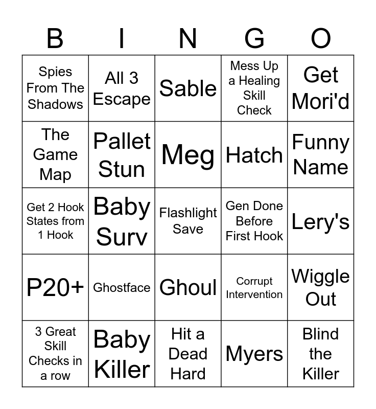 This bingo card has 25 words: Ghostface, Hit a Dead Hard, Meg, 3 Great Skill Checks in a row, Get Mori'd, Spies From The Shadows, The Game Map, All 3 Escape, Gen Done Before First Hook, Ghoul, Hatch, Get 2 Hook States from 1 Hook, Corrupt Intervention, Wiggle Out, Pallet Stun, Blind the Killer, Lery's, Sable, Funny Name, Baby Surv, Flashlight Save, Baby Killer, P20+, Mess Up a Healing Skill Check and Myers.