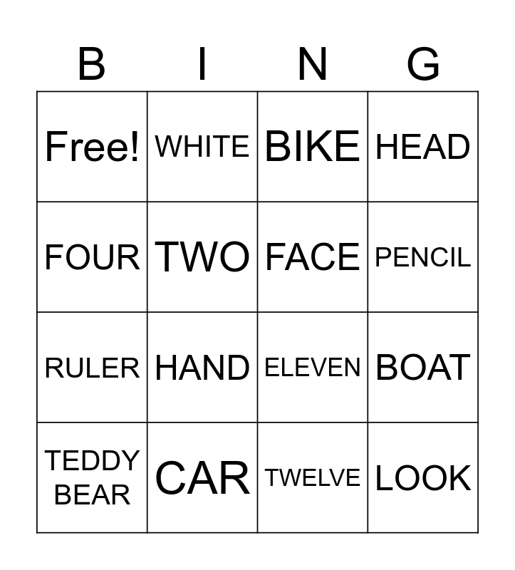 This bingo card has 16 words: TEDDY BEAR, CAR, BIKE, HEAD, FOUR, WHITE, ELEVEN, BOAT, Free!, TWO, TWELVE, PENCIL, RULER, HAND, FACE and LOOK.