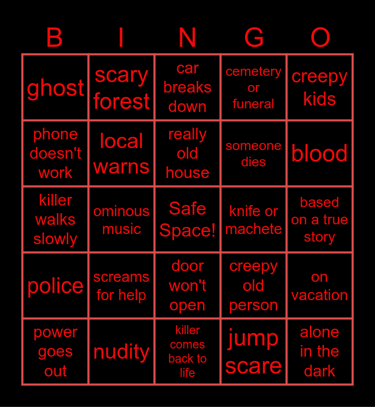 This bingo card has a free space and 24 words: screams for help, nudity, really old house, power goes out, creepy kids, ghost, phone doesn't work, scary forest, knife or machete, door won't open, someone dies, killer walks slowly, creepy old person, on vacation, local warns, jump scare, based on a true story, car breaks down, blood, ominous music, alone in the dark, police, cemetery or funeral and killer comes back to life.