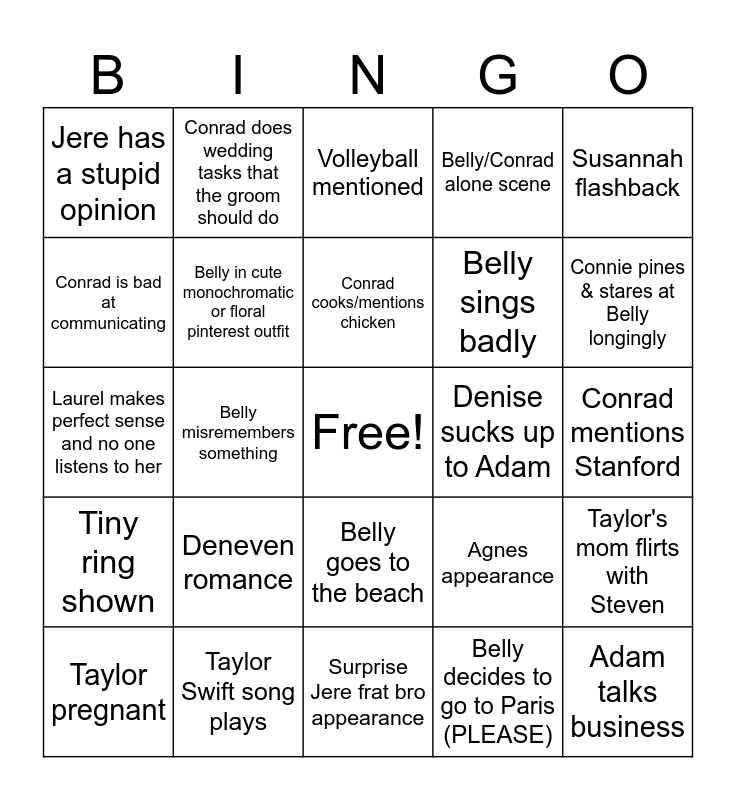 This bingo card has a free space and 24 words: Deneven romance, Taylor Swift song plays, Conrad cooks/mentions chicken, Taylor pregnant, Susannah flashback, Jere has a stupid opinion, Conrad is bad at communicating, Conrad does wedding tasks that the groom should do, Denise sucks up to Adam, Belly goes to the beach, Belly sings badly, Laurel makes perfect sense and no one listens to her, Agnes appearance, Taylor's mom flirts with Steven, Belly in cute monochromatic or floral pinterest outfit, Belly decides to go to Paris (PLEASE), Conrad mentions Stanford, Volleyball mentioned, Connie pines & stares at Belly longingly, Belly misremembers something, Adam talks business, Tiny ring shown, Belly/Conrad alone scene and Surprise Jere frat bro appearance.