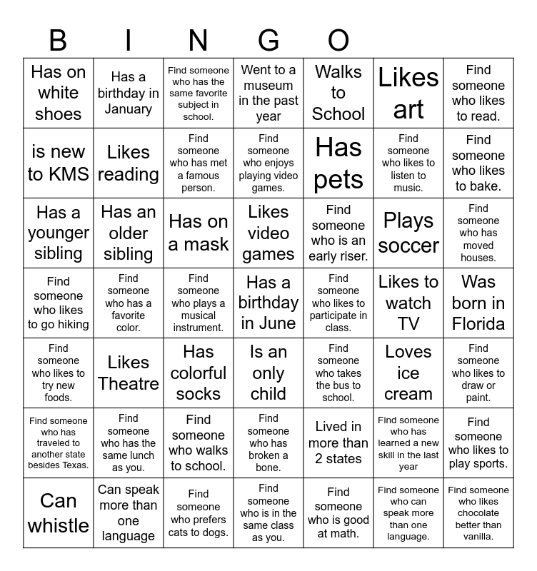 This bingo card has a free space and 63 words: Last name starts with a "B", Was born in Florida, Plays a band instrument, Plays soccer, Has colorful socks, Can whistle, Has a birthday in January, Has a "V" in their name, is new to KMS, Can speak more than one language, Likes video games, Lived in more than 2 states, Has a younger sibling, Walks to School, Rides the school bus, Likes art, Has pets, Has on white shoes, Can do pushups with one hand, Likes reading, Has on a mask, Has an older sibling, Went to a museum in the past year, Likes Theatre, Doesn't like chocolate, Loves ice cream, Is an only child, Has been to Disney, Likes to watch TV, Find someone who has traveled to another state besides Texas., Find someone who has ridden a horse., Find someone who has broken a bone., Find someone who has flown on an airplane., Find someone who has seen a concert., Find someone who has met a famous person., Find someone who has moved houses., Find someone who has learned a new skill in the last year, Find someone who plays a musical instrument., Find someone who likes to draw or paint., Find someone who likes to read., Find someone who enjoys playing video games., Find someone who likes to bake., Find someone who likes to play sports., Find someone who likes to watch movies., Find someone who likes to listen to music., Find someone who likes to go hiking, Find someone who likes chocolate better than vanilla., Find someone who is an early riser., Find someone who prefers cats to dogs., Find someone who is good at math., Find someone who can speak more than one language., Find someone who has a favorite color., Find someone who likes to try new foods., Find someone who is good at keeping secrets., Find someone who likes to dance, Find someone who has the same favorite subject in school., Find someone who walks to school., Find someone who takes the bus to school., Find someone who has the same lunch as you., Find someone who is in the same class as you., Find someone who has the same teacher as you., Find someone who likes to participate in class. and Find someone who enjoys school.