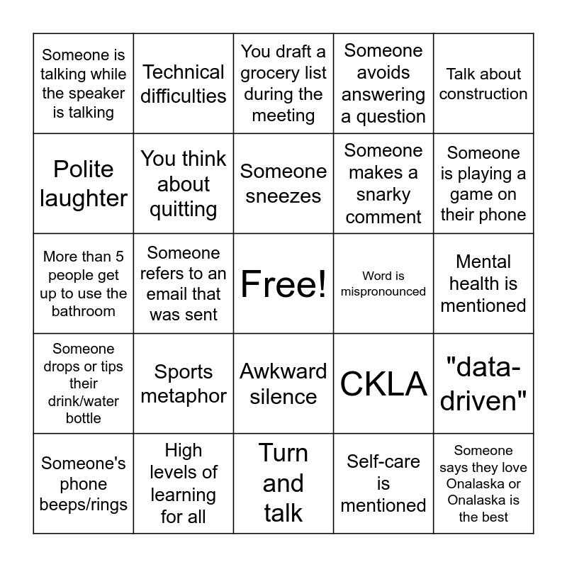 This bingo card has a free space and 24 words: Sports metaphor, High levels of learning for all, Someone sneezes, Someone's phone beeps/rings, Talk about construction, Someone is talking while the speaker is talking, Polite laughter, Technical difficulties, Word is mispronounced, Awkward silence, Someone makes a snarky comment, More than 5 people get up to use the bathroom, CKLA, "data-driven", You think about quitting, Self-care is mentioned, Mental health is mentioned, You draft a grocery list during the meeting, Someone is playing a game on their phone, Someone refers to an email that was sent, Someone says they love Onalaska or Onalaska is the best, Someone drops or tips their drink/water bottle, Someone avoids answering a question and Turn and talk.