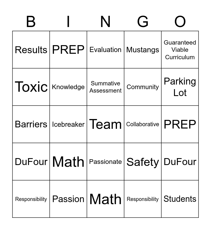 ⚠ This card has duplicate items: Collaborative (2), Supportive (2), Passionate (2), Create (2), Learning (2), Community (2), PLC (2), Agenda (2), Stiggins (2), “Honk Honk” - Goose style (2), CRISS (2), Love and Logic (2), DuFour (2), PREP (2), CFA (2), Summative Assessment (2), Hinge (2), Education (2), Shauna (2), Pay raise (2), Culture (2), Passion (2), Barriers (2), Knowledge (2), Responsibility (2), Team (2), Students (2), Productive (2), Roles (2), Guaranteed Viable Curriculum (2), Evaluation (2), Mustangs (2), Jeans Day (2), Accountability (2), Math (2), Toxic (2), Results (2), Know your why (2), Gallery Walk (2), Parking Lot (2), Icebreaker (2), Communication (2), Infinite Campus (2), Safety (2)