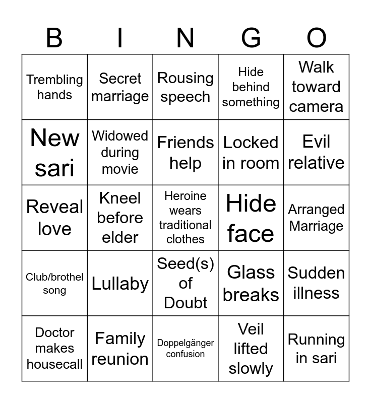 This bingo card has a free space and 134 words: separated, Dramatic faint, Mother knows best, Lost child reunited, Wedding interrupted, Song in field, Club/brothel song, Villain kidnaps someone, Dupatta/sari stuck, Rain song/dance, Melodramatic crying, Comic relief, Parent(s) oppose love, Orphan identity twist, Dramatic slap, Disguise, Lightning/thunder scene, Heirloom proves identity, Courtroom drama, Crying alone, Overprotective parent, Family reunion, Running in sari, Torn clothes, Relative reveals secret, Mistaken identity, Friends help, Dream song sequence, Inheritance plot, Boat in water, Locked in room, Secret marriage, Sudden illness, Evil relative, leaves family, Pray to God, Song in temple, Villain laughs, Comic chase scene, cliff/mountain, Hide behind something, Turn head slowly, Guns, Clutch chest in shock, Beggar, Hair blown by wind, Curtains blow, Driven out by in-laws, Hide face, Walk toward camera, Business owner, Wipe tear, Bathing scene, Love at first sight, Adjust sari, Villain reveals secret, Run through rain, Sweat stains, Confront villain alone, Kneel before elder, Reveal love, English mixed in with Hindi, Running in Garden, Peek through window, Villain trapped or caught, Love embrace, Almost Kiss, Unexpected accident, Someone dies, New sari, Sexual tension, Seed(s) of Doubt, Helen!, Someone is bad luck/cursed, Quick marriage after meeting, Dead parent(s), Run away from home, Classical dance, Radha Krishna style struggle, Sharabi, “Grape” attempt, Depression, Debt, Arranged Marriage, Change of heart, Song during opening credits, Pati=bhagwan, Pregnancy, Dead child, Chhodo!!, Widowed during movie, Fake punch sound effect, Child kidnap, Sing while working, Doppelgänger confusion, Dramatic(ish) music cue seems out of place, Poor but has a servant, Poisoned Drink, Angry mob, Miracle recovery from injury, Modern person, Lullaby, Rousing speech, Hospital scene, Father-daughter emotional bond, English names, Public humiliation, Someone treated cruelly after marriage, Illegitimate child, Nahi!!!!, Study abroad, Villain owns casino/club, Doctor makes housecall, Can’t afford medicine, Veil lifted slowly, Anklet sound, Character revealed between or behind object, Tear on photo/letter, Trembling hands, Slow motion fall down stairs, Glass breaks, Magical song location transitions, Costume changes during song, Song for comic relief, Snow!, Background dancers all dressed identical, Fake instrument playing, Harmonica, Baitho, Sibling love song, Smoking cigarette/cigar, Hookah, Dowry Problems and Young Actor playing elderly character.