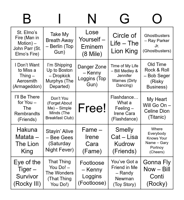 This bingo card has a free space and 25 words: Stayin’ Alive – Bee Gees (Saturday Night Fever), Footloose – Kenny Loggins (Footloose), Danger Zone – Kenny Loggins (Top Gun), Eye of the Tiger – Survivor (Rocky III), Ghostbusters – Ray Parker Jr. (Ghostbusters), St. Elmo’s Fire (Man in Motion) – John Parr (St. Elmo’s Fire), I Don’t Want to Miss a Thing – Aerosmith (Armageddon), Take My Breath Away – Berlin (Top Gun), Flashdance…What a Feeling – Irene Cara (Flashdance), Fame – Irene Cara (Fame), Time of My Life – Bill Medley & Jennifer Warnes (Dirty Dancing), I’ll Be There for You – The Rembrandts (Friends), Smelly Cat – Lisa Kudrow (Friends), Where Everybody Knows Your Name – Gary Portnoy (Cheers), I’m Shipping Up to Boston – Dropkick Murphys (The Departed), Kiss from a Rose – Seal (Batman Forever), My Heart Will Go On – Celine Dion (Titanic), Lose Yourself – Eminem (8 Mile), Old Time Rock & Roll – Bob Seger (Risky Business), Don’t You (Forget About Me) – Simple Minds (The Breakfast Club), Gonna Fly Now – Bill Conti (Rocky), That Thing You Do! – The Wonders (That Thing You Do!), Hakuna Matata – The Lion King, Circle of Life – The Lion King and You’ve Got a Friend in Me – Randy Newman (Toy Story).
