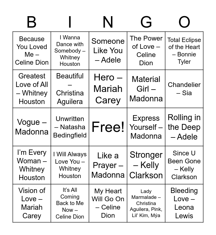 This bingo card has a free space and 25 words: I Will Always Love You – Whitney Houston, My Heart Will Go On – Celine Dion, Hero – Mariah Carey, Vision of Love – Mariah Carey, Total Eclipse of the Heart – Bonnie Tyler, Because You Loved Me – Celine Dion, Greatest Love of All – Whitney Houston, I Wanna Dance with Somebody – Whitney Houston, Express Yourself – Madonna, Like a Prayer – Madonna, Material Girl – Madonna, Vogue – Madonna, Stronger – Kelly Clarkson, Since U Been Gone – Kelly Clarkson, Beautiful – Christina Aguilera, Genie in a Bottle – Christina Aguilera, Rolling in the Deep – Adele, Someone Like You – Adele, Chandelier – Sia, Unwritten – Natasha Bedingfield, Bleeding Love – Leona Lewis, It’s All Coming Back to Me Now – Celine Dion, I’m Every Woman – Whitney Houston, The Power of Love – Celine Dion and Lady Marmalade – Christina Aguilera, Pink, Lil’ Kim, Mýa.