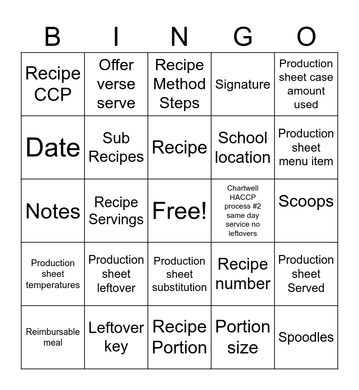 This bingo card has a free space and 31 words: Recipe Portion, Recipe ingredients, Recipe Servings, Recipe methods, Recipe CCP, Recipe Method Steps, Sub Recipes, Recipe number, Chartwell HACCP process #2 same day service no leftovers, Portion size, Scoops, Spoodles, Production Sheets, Production sheet recipe number, Production sheet menu item, Production Sheets Planned, Production sheet Served, Production sheet leftover, Production sheet temperatures, Production sheet substitution, Production sheet case amount used, Production sheet meal service, Reimbursable meal, Offer verse serve, School location, Date, Signature, Notes, Leftover key, Recipe and Grade.
