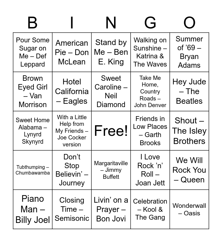 This bingo card has a free space and 25 words: Don’t Stop Believin’ – Journey, Livin’ on a Prayer – Bon Jovi, Sweet Caroline – Neil Diamond, Piano Man – Billy Joel, Summer of ’69 – Bryan Adams, Pour Some Sugar on Me – Def Leppard, Brown Eyed Girl – Van Morrison, American Pie – Don McLean, Friends in Low Places – Garth Brooks, Margaritaville – Jimmy Buffett, Take Me Home, Country Roads – John Denver, Sweet Home Alabama – Lynyrd Skynyrd, I Love Rock ’n’ Roll – Joan Jett, We Will Rock You – Queen, Hotel California – Eagles, Lean on Me – Bill Withers, Shout – The Isley Brothers, Stand by Me – Ben E. King, Hey Jude – The Beatles, With a Little Help from My Friends – Joe Cocker version, Wonderwall – Oasis, Closing Time – Semisonic, Tubthumping – Chumbawamba, Walking on Sunshine – Katrina & The Waves and Celebration – Kool & The Gang.