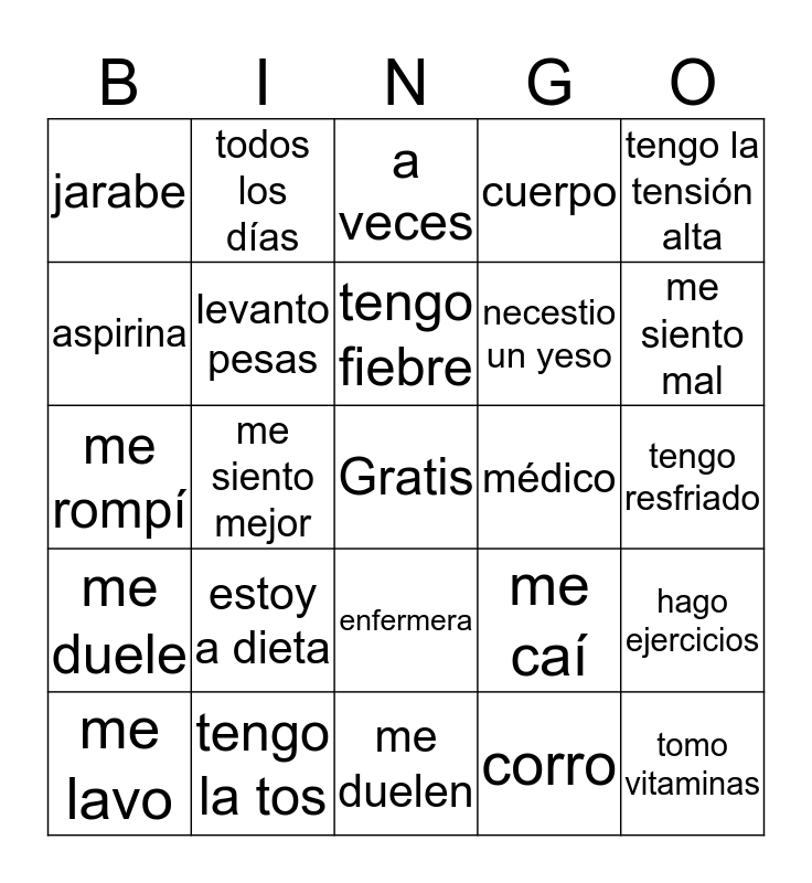 This bingo card has a free space and 24 words: estoy a dieta, tengo la tos, tengo fiebre, me lavo, tengo la tensión alta, jarabe, aspirina, todos los días, médico, enfermera, necestio un yeso, me rompí, me caí, hago ejercicios, levanto pesas, corro, tengo resfriado, a veces, me siento mal, me siento mejor, tomo vitaminas, me duele, cuerpo and me duelen.