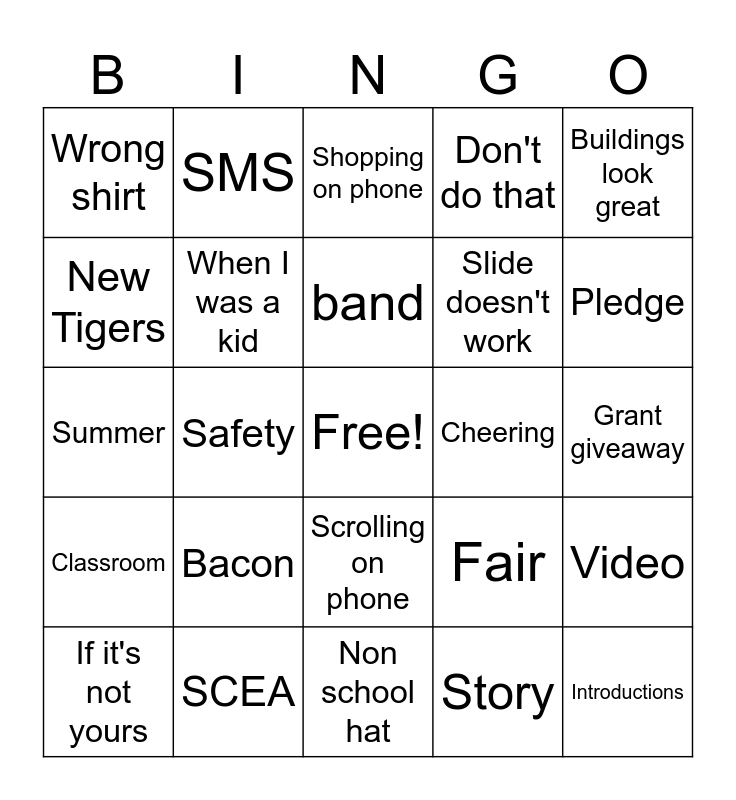 This bingo card has a free space and 24 words: Bacon, SCEA, band, If it's not yours, Buildings look great, Wrong shirt, New Tigers, SMS, Cheering, Scrolling on phone, Slide doesn't work, Summer, Fair, Video, When I was a kid, Story, Grant giveaway, Shopping on phone, Pledge, Safety, Introductions, Classroom, Don't do that and Non school hat.