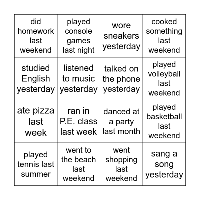 This bingo card has 25 words: Free!, played football yesterday, played volleyball last weekend, watched a movie last night, studied English yesterday, did homework last weekend, listened to music yesterday, played console games last night, went to the beach last weekend, swam in a pool last summer, ate pizza last week, danced at a party last month, helped at home yesterday, visited a friend last weekend, talked on the phone yesterday, drew or painted last week, went shopping last weekend, wore sneakers yesterday, ran in P.E. class last week, played basketball last weekend, played tennis last summer, read a book last week, sang a song yesterday, cooked something last weekend and played board games with family.