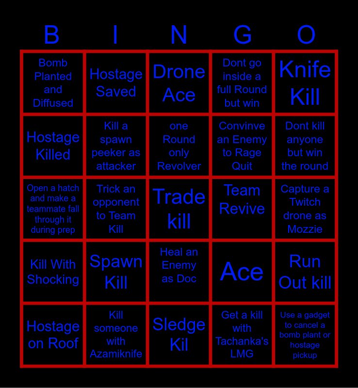 This bingo card has 25 words: Spawn Kill, Sledge Kil, one Round only Revolver, Hostage on Roof, Knife Kill, Bomb Planted and Diffused, Hostage Killed, Hostage Saved, Team Revive, Heal an Enemy as Doc, Convinve an Enemy to Rage Quit, Open a hatch and make a teammate fall through it during prep, Ace, Run Out kill, Kill a spawn peeker as attacker, Use a gadget to cancel a bomb plant or hostage pickup, Capture a Twitch drone as Mozzie, Drone Ace, Dont kill anyone but win the round, Trick an opponent to Team Kill, Trade kill, Kill someone with Azamiknife, Kill With Shocking, Dont go inside a full Round but win and Get a kill with Tachanka's LMG.