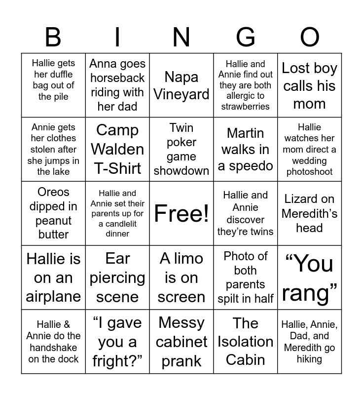 This bingo card has a free space and 24 words: Ear piercing scene, “I gave you a fright?”, Twin poker game showdown, Hallie & Annie do the handshake on the dock, Lost boy calls his mom, Hallie gets her duffle bag out of the pile, Annie gets her clothes stolen after she jumps in the lake, Anna goes horseback riding with her dad, Hallie and Annie discover they’re twins, A limo is on screen, Martin walks in a speedo, Oreos dipped in peanut butter, Photo of both parents spilt in half, “You rang”, Camp Walden T-Shirt, The Isolation Cabin, Lizard on Meredith’s head, Napa Vineyard, Hallie watches her mom direct a wedding photoshoot, Hallie and Annie set their parents up for a candlelit dinner, Hallie, Annie, Dad, and Meredith go hiking, Hallie is on an airplane, Hallie and Annie find out they are both allergic to strawberries and Messy cabinet prank.