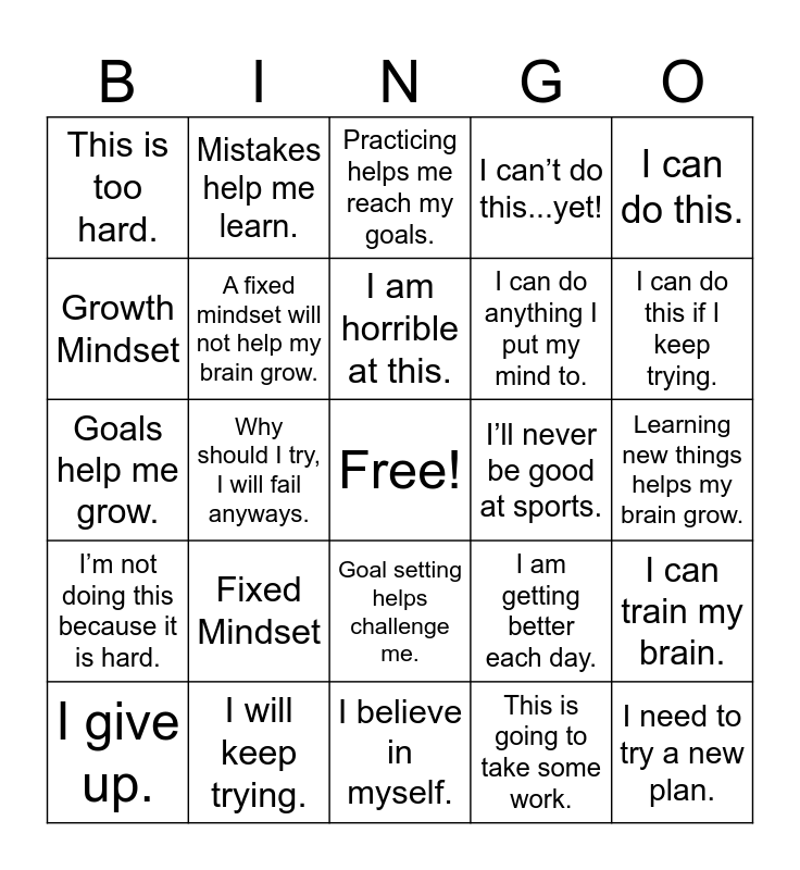This bingo card has a free space and 24 words: Fixed Mindset, I will keep trying., I am horrible at this., I give up., I can do this., This is too hard., Growth Mindset, Mistakes help me learn., I’ll never be good at sports., Goal setting helps challenge me., I can do anything I put my mind to., Goals help me grow., I am getting better each day., I can train my brain., A fixed mindset will not help my brain grow., This is going to take some work., Learning new things helps my brain grow., Practicing helps me reach my goals., I can do this if I keep trying., Why should I try, I will fail anyways., I need to try a new plan., I’m not doing this because it is hard., I can’t do this...yet! and I believe in myself..
