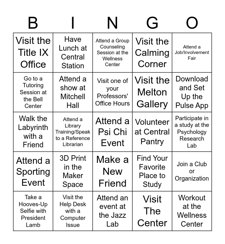 This bingo card has a free space and 24 words: 3D Print in the Maker Space, Visit the Help Desk with a Computer Issue, Visit one of your Professors' Office Hours, Take a Hooves-Up Selfie with President Lamb, Attend a Job/Involvement Fair, Visit the Title IX Office, Go to a Tutoring Session at the Bell Center, Have Lunch at Central Station, Volunteer at Central Pantry, Make a New Friend, Visit the Melton Gallery, Walk the Labyrinth with a Friend, Find Your Favorite Place to Study, Join a Club or Organization, Attend a show at Mitchell Hall, Visit The Center, Participate in a study at the Psychology Research Lab, Attend a Group Counseling Session at the Wellness Center, Download and Set Up the Pulse App, Attend a Library Training/Speak to a Reference Librarian, Workout at the Wellness Center, Attend a Sporting Event, Visit the Calming Corner and Attend an event at the Jazz Lab.