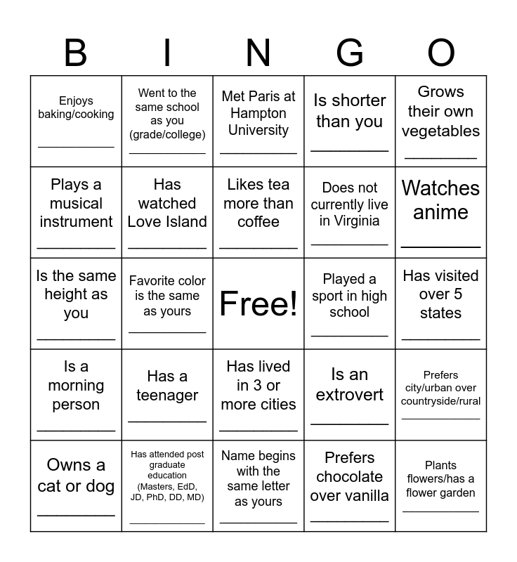 This bingo card has a free space and 24 words: Has a teenager _________, Has attended post graduate education (Masters, EdD, JD, PhD, DD, MD) _______________, Likes tea more than coffee _________, Owns a cat or dog ________, Grows their own vegetables ________, Enjoys baking/cooking ____________, Plays a musical instrument _________, Went to the same school as you (grade/college) ____________, Played a sport in high school __________, Has lived in 3 or more cities _________, Does not currently live in Virginia __________, Is the same height as you _________, Is an extrovert ________, Prefers city/urban over countryside/rural _____________, Has watched Love Island _________, Prefers chocolate over vanilla _________, Has visited over 5 states _________, Met Paris at Hampton University __________, Watches anime _______, Favorite color is the same as yours ___________, Plants flowers/has a flower garden ____________, Is a morning person _________, Is shorter than you ________ and Name begins with the same letter as yours ___________.