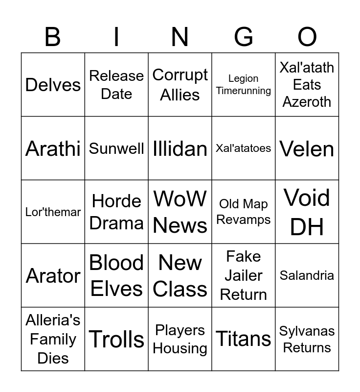 This bingo card has a free space and 24 words: Blood Elves, Trolls, Illidan, Alleria's Family Dies, Xal'atath Eats Azeroth, Delves, Arathi, Release Date, Old Map Revamps, New Class, Xal'atatoes, Lor'themar, Fake Jailer Return, Salandria, Sunwell, Titans, Void DH, Corrupt Allies, Velen, Horde Drama, Sylvanas Returns, Arator, Legion Timerunning and Players Housing.