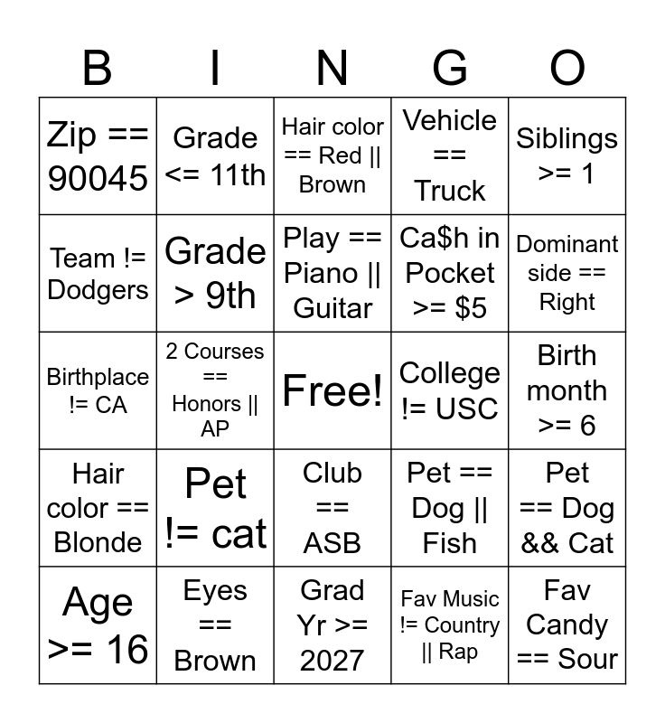 This bingo card has a free space and 24 words: Pet != cat, Eyes == Brown, Play == Piano || Guitar, Age >= 16, Siblings >= 1, Zip == 90045, Team != Dodgers, Grade <= 11th, College != USC, Club == ASB, Ca$h in Pocket >= $5, Birthplace != CA, Pet == Dog || Fish, Pet == Dog && Cat, Grade > 9th, Fav Music != Country || Rap, Birth month >= 6, Hair color == Red || Brown, Dominant side == Right, 2 Courses == Honors || AP, Fav Candy == Sour, Hair color == Blonde, Vehicle == Truck and Grad Yr >= 2027.