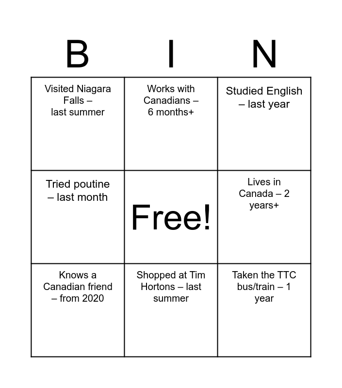 This bingo card has a free space and 8 words: Lives in Canada – 2 years+, Studied English – last year, Works with Canadians – 6 months+, Knows a Canadian friend – from 2020, Visited Niagara Falls – last summer, Taken the TTC bus/train – 1 year, Tried poutine – last month and Shopped at Tim Hortons – last summer.