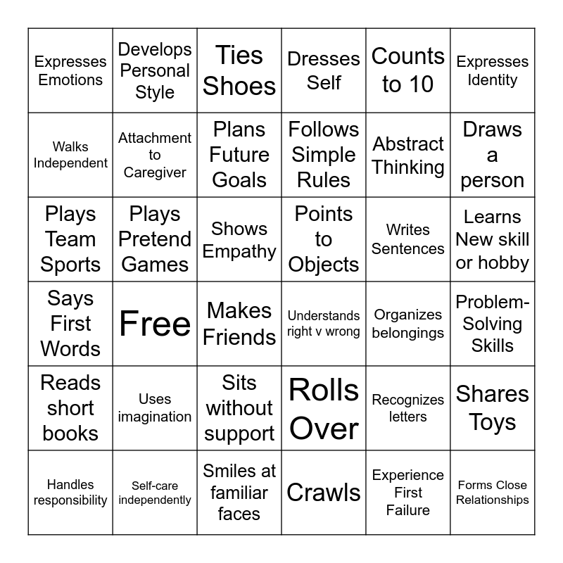 This bingo card has 36 words: Rolls Over, Sits without support, Crawls, Walks Independent, Says First Words, Points to Objects, Attachment to Caregiver, Smiles at familiar faces, Counts to 10, Recognizes letters, Draws a person, Dresses Self, Shares Toys, Plays Pretend Games, Follows Simple Rules, Expresses Emotions, Reads short books, Writes Sentences, Plays Team Sports, Ties Shoes, Shows Empathy, Free, Understands right v wrong, Makes Friends, Organizes belongings, Develops Personal Style, Abstract Thinking, Self-care independently, Plans Future Goals, Expresses Identity, Forms Close Relationships, Handles responsibility, Problem-Solving Skills, Learns New skill or hobby, Uses imagination and Experience First Failure.