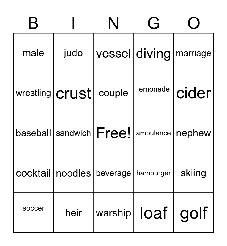 This bingo card has a free space and 24 words: noodles, heir, couple, soccer, marriage, male, wrestling, judo, ambulance, beverage, lemonade, baseball, hamburger, skiing, crust, loaf, nephew, vessel, cider, sandwich, golf, cocktail, diving and warship.