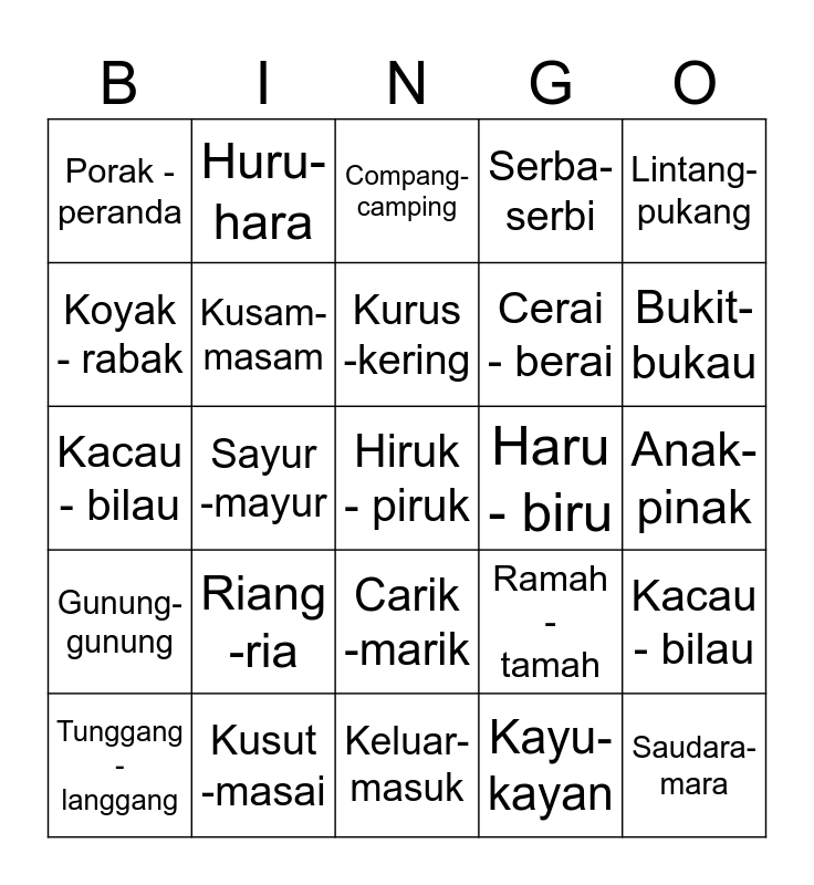 This bingo card has a free space and 24 words: Riang -ria, Kusut -masai, Kurus -kering, Tunggang - langgang, Lintang-pukang, Porak -peranda, Koyak - rabak, Huru-hara, Haru - biru, Carik -marik, Cerai - berai, Kacau - bilau, Ramah - tamah, Kacau - bilau, Kusam-masam, Kayu-kayan, Anak-pinak, Compang-camping, Bukit-bukau, Sayur -mayur, Saudara-mara, Gunung-gunung, Serba-serbi and Keluar-masuk.