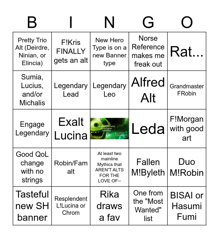 This bingo card has a free space and 24 words: Robin/Fam alt, Resplendent L!Lucina or Chrom, Legendary Leo, Tasteful new SH banner, Rat..., Pretty Trio Alt (Deirdre, Ninian, or Elincia), Sumia, Lucius, and/or Michalis, F!Kris FINALLY gets an alt, Leda, At least two mainline Mythics that AREN'T ALTS FOR THE LOVE OF--, Alfred Alt, Engage Legendary, Fallen M!Byleth, Duo M!Robin, Legendary Lead, One from the "Most Wanted" list, F!Morgan with good art, New Hero Type is on a new Banner type, Grandmaster FRobin, Exalt Lucina, BISAI or Hasumi Fumi, Good QoL change with no strings, Norse Reference makes me freak out and Rika draws a fav.