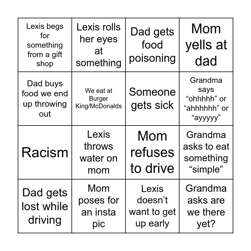This bingo card has 43 words: Free!, Dad gets lost while driving, Dad spills something on his shirt, Dad pretends to make out with mom, Dad gets scammed, Dad sings badly, Dad gets food poisoning, Dad tries to scam grandma, Dad buys food we end up throwing out, Mom downplays the price of things, Mom yells at dad, Mom poses for an insta pic, Mom loses her phone, Mom ask for a hair tie, Mom goes to the bathroom twice in an hour, Mom rushes everyone everywhere, Mom chickens out, Mom refuses to drive, Mom says “ay mi hombro”, Lexis throws water on mom, Lexis rolls her eyes at something, Lexis asks what/when/where are we going to eat?, Lexis complains about waiting in line, Lexis begs for something from a gift shop, Lexis gets angry, Lexis doesn’t want to get up early, Lexis takes forever in the bathroom, Lexis can’t choose an outfit, Lexis accidentally hurts mom, Grandma asks are we there yet?, Grandma refuses to sit in wheelchair, Grandma calls a dish “esquisito”/ “ricisimo”, Grandma refuses to eat/say what she wants to eat, Grandma asks to eat something “simple”, Grandma needs pepto bismol, Grandma being slow, Grandma asking for the bathroom, Grandma says “ohhhhh” or “ahhhhhh” or “ayyyyy”, We eat at Burger King/McDonalds, Racism, Making fun of people, Someone gets sick and Someone does something stupid/embarrassing.