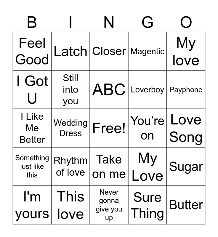 This bingo card has a free space and 24 words: Rhythm of love, This love, ABC, I'm yours, My love, Feel Good, I Got U, Latch, You’re on, Take on me, Loverboy, I Like Me Better, My Love, Sugar, Still into you, Sure Thing, Love Song, Closer, Payphone, Wedding Dress, Butter, Something just like this, Magentic and Never gonna give you up.