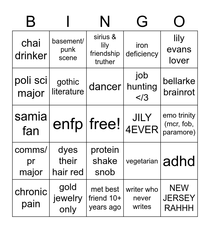 This bingo card has a free space and 24 words: dyes their hair red, gold jewelry only, dancer, chronic pain, lily evans lover, chai drinker, poli sci major, basement/ punk scene, JILY 4EVER, protein shake snob, job hunting </3, samia fan, vegetarian, adhd, gothic literature, writer who never writes, emo trinity (mcr, fob, paramore), sirius & lily friendship truther, bellarke brainrot, enfp, NEW JERSEY RAHHH, comms/ pr major, iron deficiency and met best friend 10+ years ago.