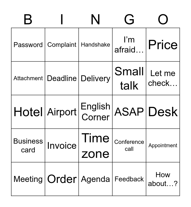 This bingo card has a free space and 24 words: Invoice, Order, Delivery, Meeting, Price, Password, Attachment, Complaint, ASAP, Time zone, Small talk, Hotel, Conference call, Appointment, Deadline, Feedback, Desk, Handshake, Let me check…, Airport, How about…?, Business card, I’m afraid… and Agenda.