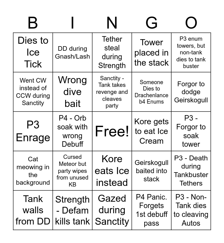 This bingo card has a free space and 24 words: Cursed Meteor but party wipes from unused KB, Strength - Defam kills tank, Sanctity - Tank takes revenge and cleaves party, Tank walls from DD, P3 enum towers, but non-tank dies to tank buster, Dies to Ice Tick, Went CW instead of CCW during Sanctity, DD during Gnash/Lash, Kore gets to eat Ice Cream, Kore eats Ice instead, Someone Dies to Drachenlance b4 Enums, P3 Enrage, Geirskogull baited into stack, P3 - Death during Tankbuster Tethers, Wrong dive bait, P4 Panic. Forgets 1st debuff pass, P3 - Forgor to soak tower, Tether steal during Strength, Forgor to dodge Geirskogull, P4 - Orb soak with wrong Debuff, P3 - Non-Tank dies to cleaving Autos, Cat meowing in the background, Tower placed in the stack and Gazed during Sanctity.