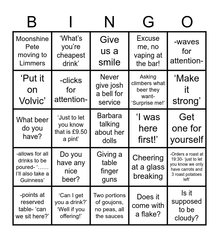 This bingo card has 34 words: Is it supposed to be cloudy?, Does it come with a flake?, Empty plate - ‘I hated it’, How much?!, -allows for all drinks to be poured- ‘……I’ll also take a Guinness’, -clicks for attention-, -waves for attention-, -points at reserved table- ‘can we sit here?’, ‘What’s you’re cheapest drink’, -card reader doesn’t work- ‘must be free!’, Never give josh a bell for service, Give us a smile, ‘I know the owner’, Elsa sprinting round the bar, ‘I was here first!’, ‘Make it strong’, ‘Can I get you a drink?’ ‘Well if you offering!’, What beer do you have?, Do you have any nice beer?, Cheering at a glass breaking, Giving a table finger guns, Elsa waving at the till, Moonshine Pete moving to Limmers, Get one for yourself, Two portions of goujons, no peas, all the sauces, Barbara talking about her dolls, Excuse me, no vaping at the bar!, Balding Eagle, Asking climbers what beer they want- ‘Surprise me!’, ‘Put it on Volvic’, ‘That’s a big sausage…..’, ‘Just to let you know that is £9.50 a pint’, -Orders a roast at 19:30- ‘just to let you know we only have carrots and 3 roast potatoes left’ and ‘Fat chips or skinny fries?’.