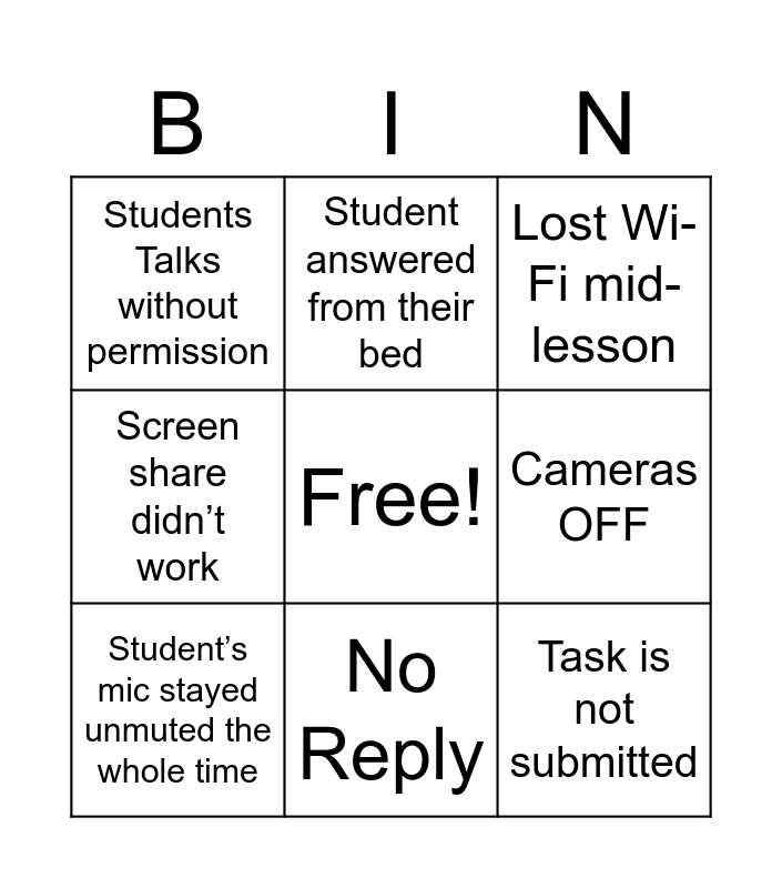 This bingo card has a free space and 9 words: Student’s mic stayed unmuted the whole time, Lost Wi-Fi mid-lesson, Student answered from their bed, Screen share didn’t work, Students Talks without permission, Cameras OFF, Task is not submitted, Electricity cut off and No Reply.