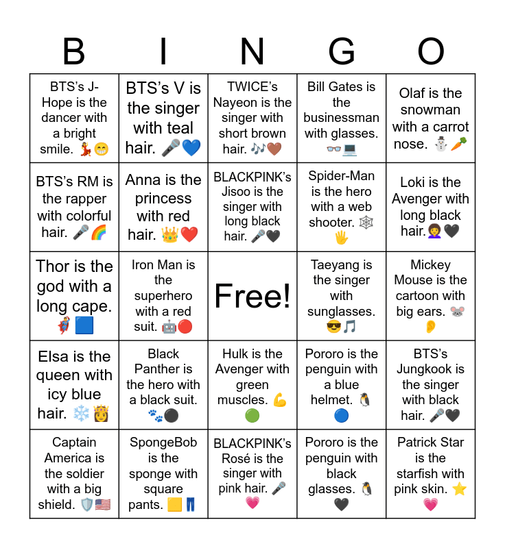 This bingo card has a free space and 32 words: Pororo is the penguin with black glasses. π§π€, Thor is the Avenger member with a big hammer. β‘π οΈ, Iron Man is the superhero with a red suit. π€π΄, Spider-Man is the hero with a red and blue suit. π·οΈπ΄π΅, Elsa is the queen with icy blue hair. βοΈπΈ, Anna is the princess with red hair. πβ€οΈ, Olaf is the snowman with a carrot nose. βπ₯, BTSβs Jungkook is the singer with black hair. π€π€, BTSβs V is the singer with teal hair. π€π, BLACKPINKβs Lisa is the dancer with blonde hair. ππ, BLACKPINKβs Jisoo is the singer with long black hair. π€π€, TWICEβs Nayeon is the singer with short brown hair. πΆπ€, TWICEβs Momo is the dancer with a ponytail. πβ¨, IU is the singer with a sweet smile. π€π, Taeyang is the singer with sunglasses. ππ΅, Iron Man is the inventor with a glowing chest. π€β¨, Captain America is the soldier with a big shield. π‘οΈπΊπΈ, Thor is the god with a long cape. π¦ΈββοΈπ¦, Hulk is the Avenger with green muscles. πͺπ’, Black Panther is the hero with a black suit. πΎβ«, Pororo is the penguin with a blue helmet. π§π΅, Olaf is the snowman with twig arms. βπΏ, Mickey Mouse is the cartoon with big ears. ππ, SpongeBob is the sponge with square pants. π¨π, Patrick Star is the starfish with pink skin. βπ, Bill Gates is the businessman with glasses. ππ», Spider-Man is the hero with a web shooter. πΈοΈποΈ, BTSβs RM is the rapper with colorful hair. π€π, BTSβs J-Hope is the dancer with a bright smile. ππ, BLACKPINKβs RosΓ© is the singer with pink hair. π€π, TWICEβs Dahyun is the singer with a cheerful face. πΆπ and Loki is the Avenger with long black hair.π©βπ¦±π€.