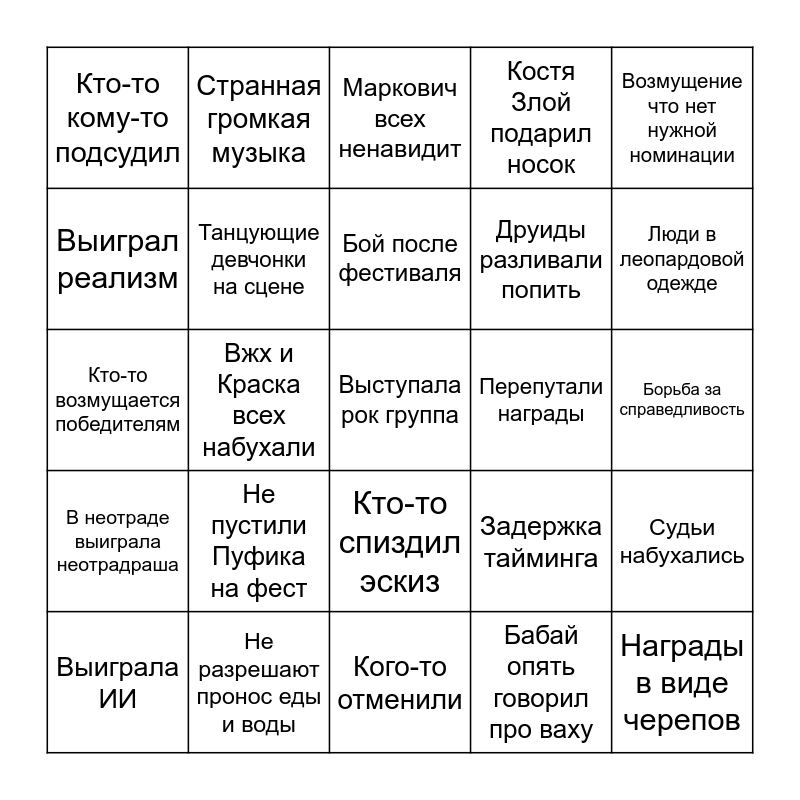 This bingo card has a free space and 24 words: Не пустили Пуфика на фест, Не разрешают пронос еды и воды, Бой после фестиваля, Выиграла ИИ, Возмущение что нет нужной номинации, Кто-то кому-то подсудил, Выиграл реализм, Странная громкая музыка, Перепутали награды, Кто-то спиздил эскиз, Друиды разливали попить, Кто-то возмущается победителям, Задержка тайминга, Судьи набухались, Танцующие девчонки на сцене, Бабай опять говорил про ваху, Борьба за справедливость, Маркович всех ненавидит, Люди в леопардовой одежде, Вжх и Краска всех набухали, Награды в виде черепов, В неотраде выиграла неотрадраша, Костя Злой подарил носок and Кого-то отменили.