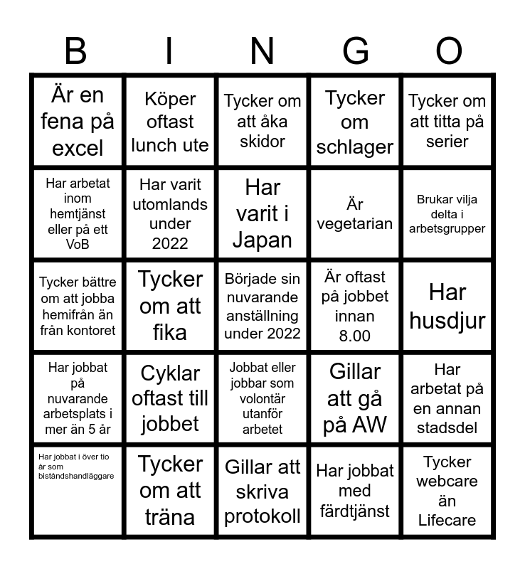 This bingo card has a free space and 24 words: Har jobbat i över tio år som biståndshandläggare, Cyklar oftast till jobbet, Har varit i Japan, Har jobbat med färdtjänst, Tycker om att titta på serier, Är en fena på excel, Köper oftast lunch ute, Tycker om att åka skidor, Är oftast på jobbet innan 8.00, Har husdjur, Tycker bättre om att jobba hemifrån än från kontoret, Har varit utomlands under 2022, Gillar att gå på AW, Har arbetat på en annan stadsdel, Har arbetat inom hemtjänst eller på ett VoB, Tycker om att träna, Gillar att skriva protokoll, Tycker om schlager, Brukar vilja delta i arbetsgrupper, Har jobbat på nuvarande arbetsplats i mer än 5 år, Tycker om att fika, Jobbat eller jobbar som volontär utanför arbetet, Är vegetarian and Tycker webcare än Lifecare.