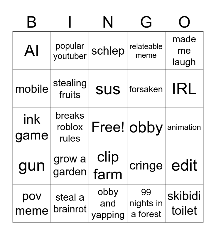This bingo card has a free space and 24 words: grow a garden, steal a brainrot, sus, pov meme, made me laugh, AI, mobile, popular youtuber, obby, clip farm, forsaken, ink game, cringe, edit, stealing fruits, 99 nights in a forest, animation, schlep, IRL, breaks roblox rules, skibidi toilet, gun, relateable meme and obby and yapping.