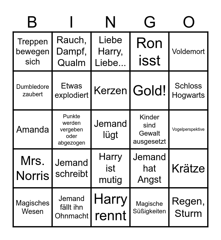 This bingo card has 35 words: Objekt erwacht zum Leben, Harrys Narbe schmerzt, Wingardium Leviosa, Etwas explodiert, Harry ist mutig, Ron isst, Dumbledore zaubert, Jemand/etwas verwandelt sich, Kerzen, Ein*e Schüler*in außer Hermine zaubert, Amanda, Voldemort, sprechendes Bild, Jemand sagt "Stein der Weisen", Treppen bewegen sich, Kinder sind Gewalt ausgesetzt, Magische Süßigkeiten, Punkte werden vergeben oder abgezogen, Mrs. Norris, Jemand lügt, Jemand hat Angst, Magisches Wesen, Krätze, Jemand fällt ihn Ohnmacht, Liebe Harry, Liebe..., Schloss Hogwarts, Regen, Sturm, Jemand ist gemein zu Harry, Gold!, Vogelperspektive, Eule bringt etwas, Harry rennt, Jemand schreibt, Rauch, Dampf, Qualm and Ritterrüstung.