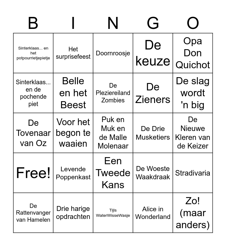 This bingo card has 35 words: Robin Hood, Aladdin, Repelsteel, Belle en het Beest, Een Tweede Kans, De keuze, Sinterklaas... en de pochende piet, Pinokkio, De Pleziereiland Zombies, De Jarige Job, De Tovenaar van Oz, Opa Don Quichot, Kermiskriebel!, Moeder Courage, Sinterklaas... en het potpourrietjepietje, De Drie Musketiers, Alice in Wonderland, Voor het begon te waaien, Free!, Puk en Muk en de Malle Molenaar, De Woeste Waakdraak, De Rattenvanger van Hamelen, Stradivaria, Drie harige opdrachten, Doornroosje, De slag wordt 'n big, Zo! (maar anders), De Nul, de Niks en de Niemand, De Zieners, De Nieuwe Kleren van de Keizer, De Viezerikken, Tijls WaterWisseWasje, Levende Poppenkast, Het surprisefeest and Het bos van de witte wieven.