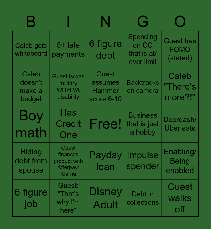 This bingo card has a free space and 30 words: Guest: "That's why I'm here", Girl math, Has Credit One, Took from 401k, Caleb gets whiteboard, 6 figure debt, Guest is/was military WITH VA disability, Payday loan, Business that is just a hobby, Disney Adult, Doordash/ Uber eats, Guest walks off, Debt in collections, Caleb views guest Amazon, Caleb "There's more?!", Guest blames debt on partner, Impulse spender, Hiding debt from spouse, Guest finances product with Afterpay/ Klarna, Guest has FOMO (stated), Boy math, 28.99 APR, 5+ late payments, Backtracks on camera, Caleb doesn't make a budget, Spending on CC that is at/ over limit, Enabling/ Being enabled, 6 figure job, Guest assumes Hammer score 6-10 and Guest: "Spend money to make money".
