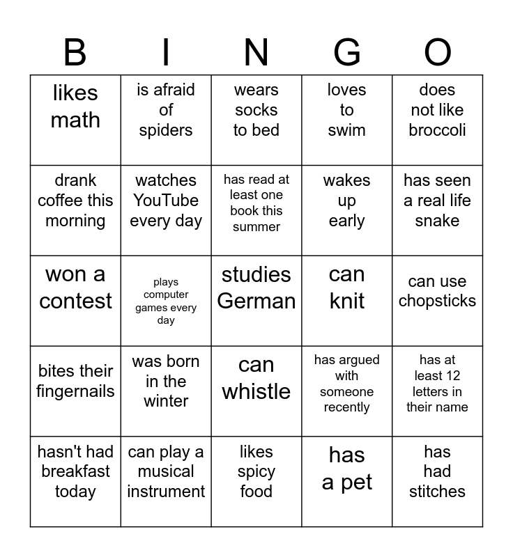 This bingo card has 25 words: was born in the winter, likes spicy food, has read at least one book this summer, hasn't had breakfast today, does not like broccoli, likes math, drank coffee this morning, is afraid of spiders, can knit, can whistle, wakes up early, won a contest, has argued with someone recently, has at least 12 letters in their name, watches YouTube every day, has had stitches, can use chopsticks, wears socks to bed, has seen a real life snake, plays computer games every day, studies German, can play a musical instrument, bites their fingernails, loves to swim and has a pet.
