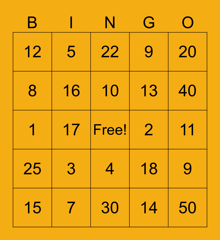 This bingo card has a free space and 24 words: 3, 7, 10, 15, 20, 12, 8, 5, 2, 4, 13, 1, 18, 9, 16, 14, 11, 22, 40, 17, 50, 25, 9 and 30.