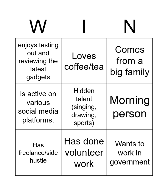 This bingo card has 18 words: is proficient in coding and programming languages., can troubleshoot and fix computer-related issues., Comes from a big family, enjoys testing out and reviewing the latest gadgets, Believes failure = growth, is active on various social media platforms., has been a team leader before, Loves coffee/tea, Has done volunteer work, Wants to work in government, Loves helping others, Hidden talent (singing, drawing, sports), Has done part-time job, Morning person, Has freelance/side hustle, Wants to pursue further studies, Enjoys gaming and Dreams of starting a business.